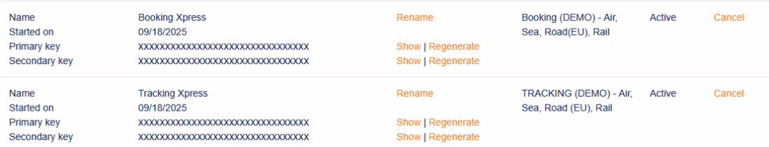 Jetzt generieren Sie den Personal Access Token, indem Sie auf „Regenerate xPat“ klicken und fügen diesen im ShipXpert in das Feld Personal Access Token ein.- Danach nehmen Sie den Booking Primary Key und Tracking Primary Key aus dem Product Subscriptions Bereich und fügen diese im ShipXpert Versand in die Felder Booking Product Subscription und Tracking Product Subscription ein.
