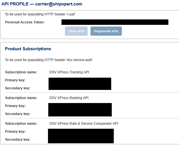 Jetzt generieren Sie den Personal Access Token, indem Sie auf „Regenerate xPat“ klicken und fügen diesen im ShipXpert in das Feld Personal Access Token ein.- Danach nehmen Sie den Booking Primary Key und Tracking Primary Key aus dem Product Subscriptions Bereich und fügen diese im ShipXpert Versand in die Felder Booking Product Subscription und Tracking Product Subscription ein.
